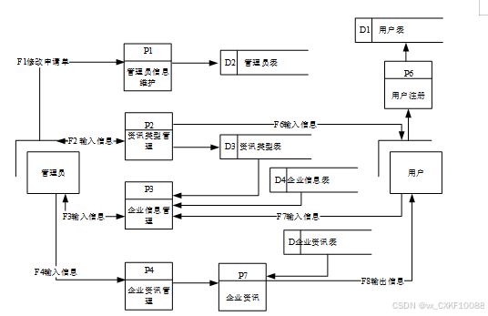 系统底层数据流:外部实体为管理员、普通用户和企业用户,数据流分别有管理员、普通用户和企业用户流向系统数据流程,数据表提供数据支持,来完成逻辑操作。