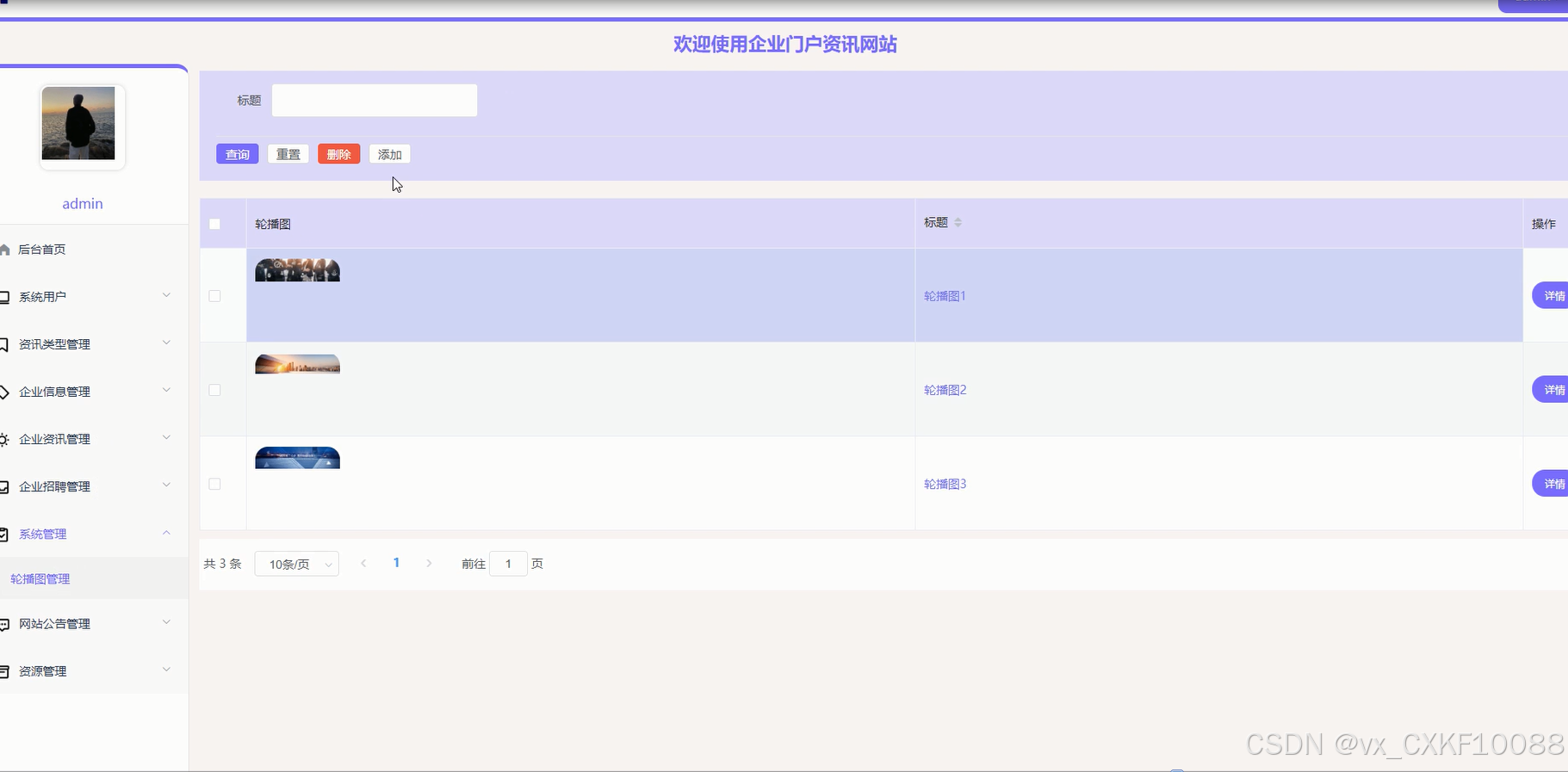管理员可以对系统前台展示的轮播图进行增删改查,方便用户进行查看。轮播图管理界面如下图所示。