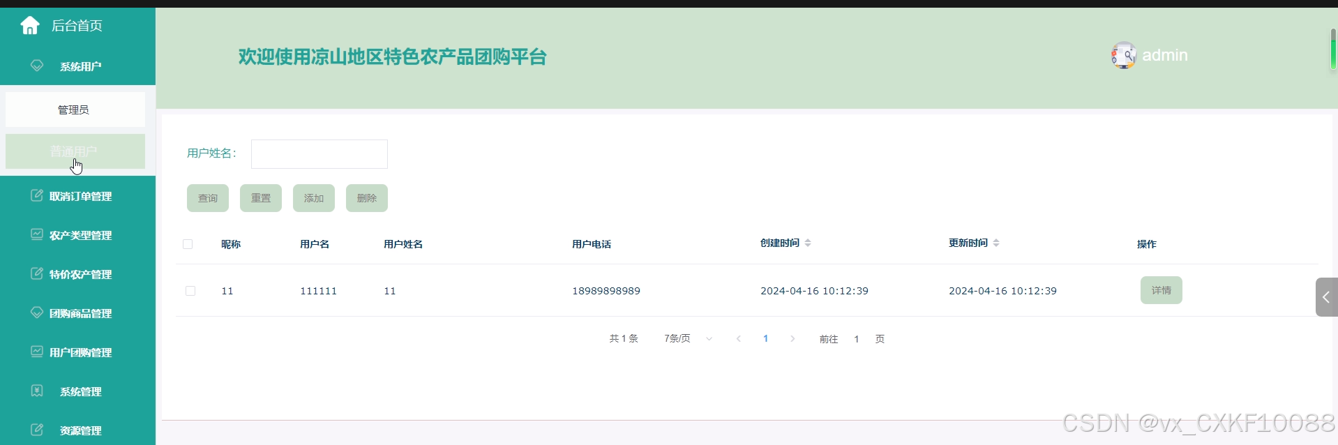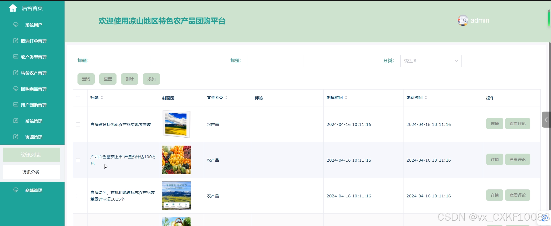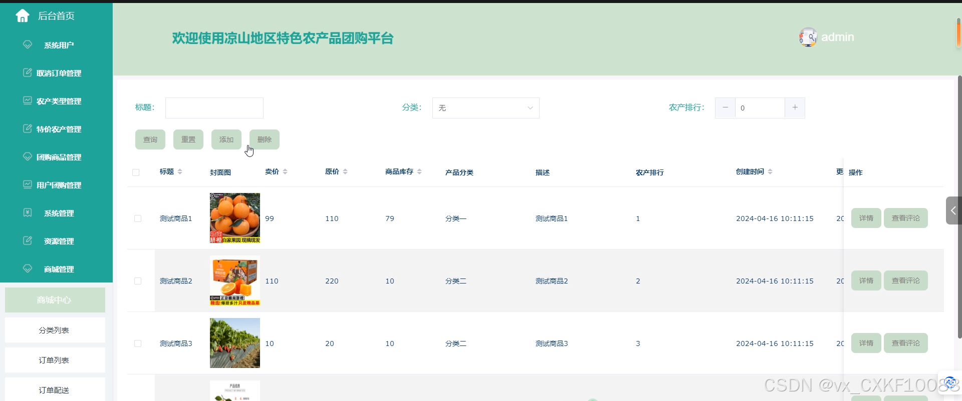 - 团购商品管理:管理员可以查看团购商品列表中某个农产品的详情和评论,可以对团购商品信息进行增删改查操作。