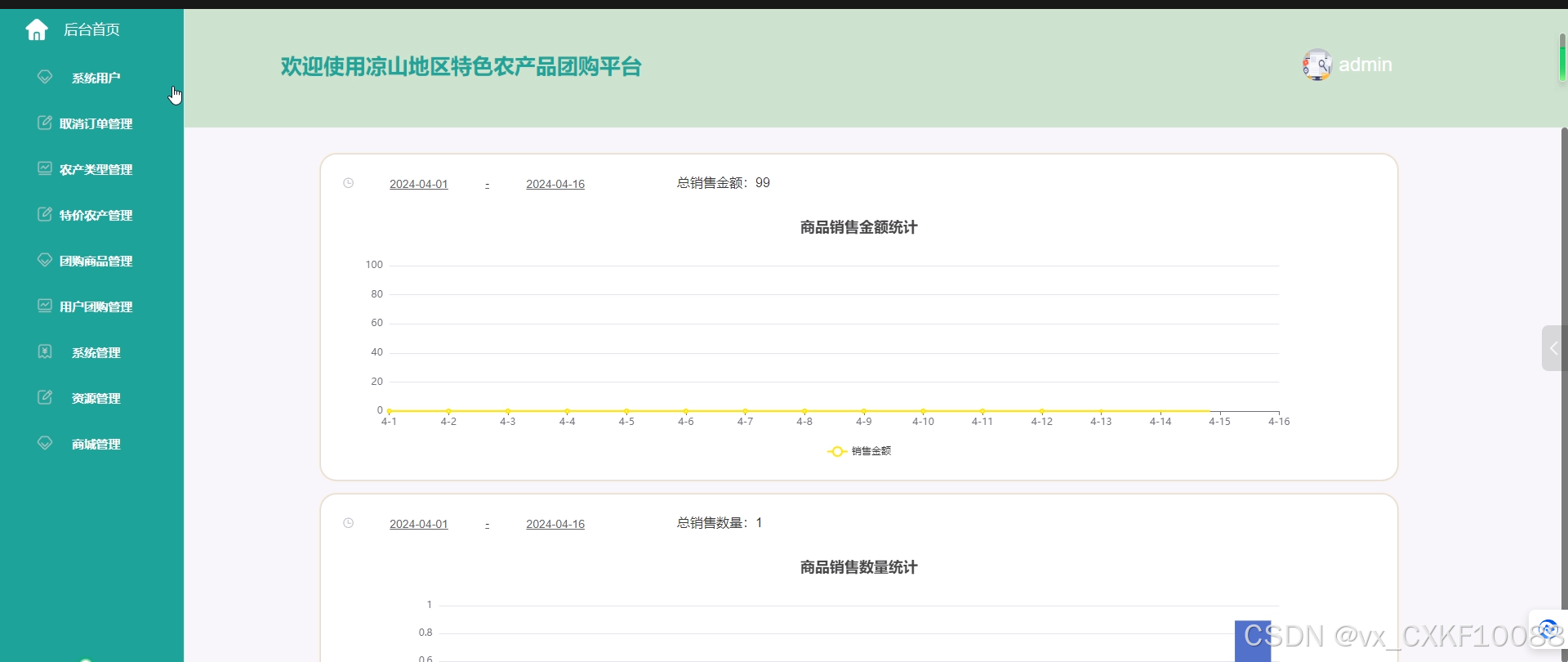 - 后台首页:管理员可以查看后台首页展示商品销售金额统计和商品销售数量统计信息。