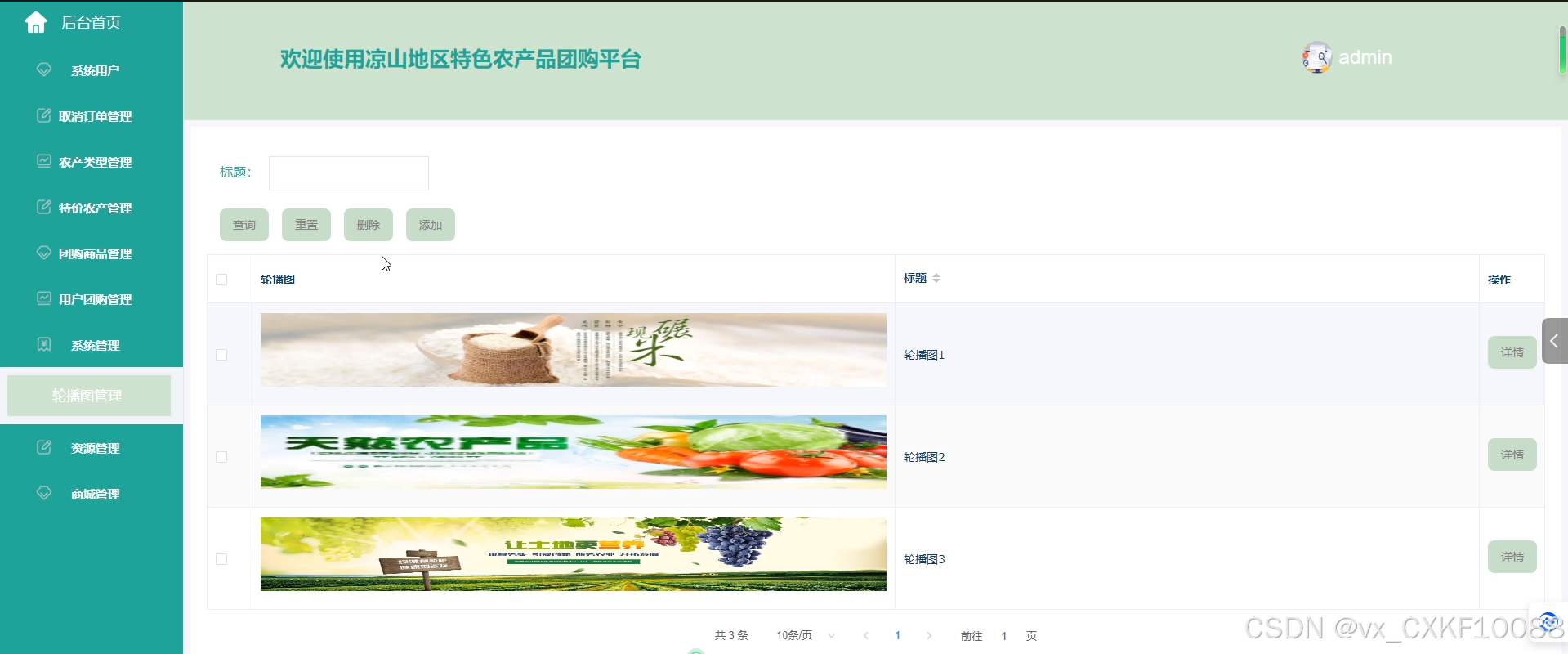 - 系统管理:管理人员在“系统管理”这一菜单下对轮播图进行管控,可以对轮播图信息进行增删改查操作。