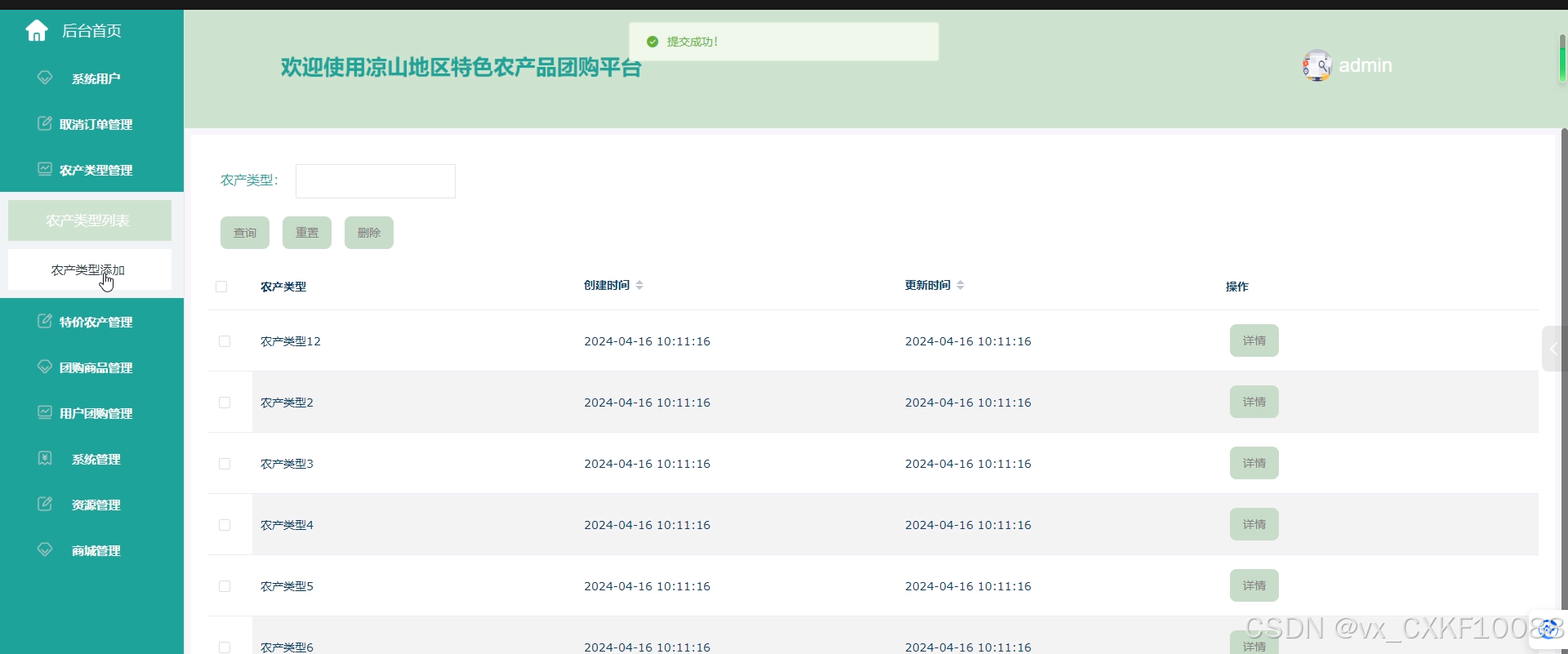 - 农产类型管理:管理员可以查看农产类型列表中某个类型的详情,可以对农产类型信息进行增删改查操作。