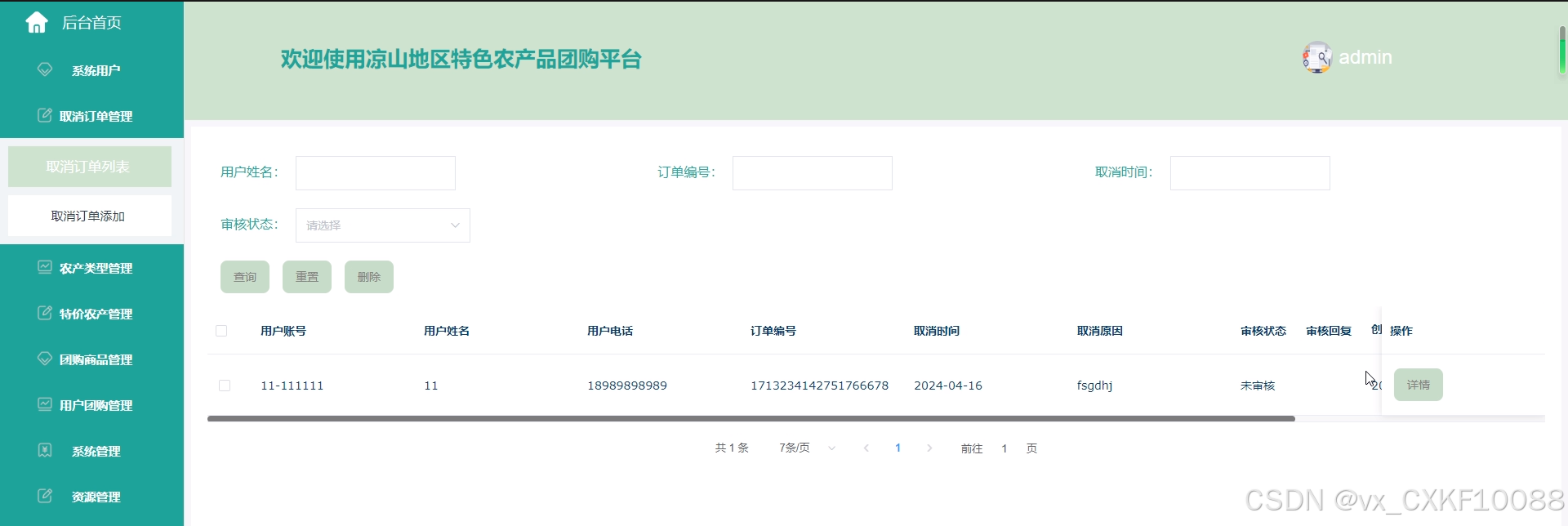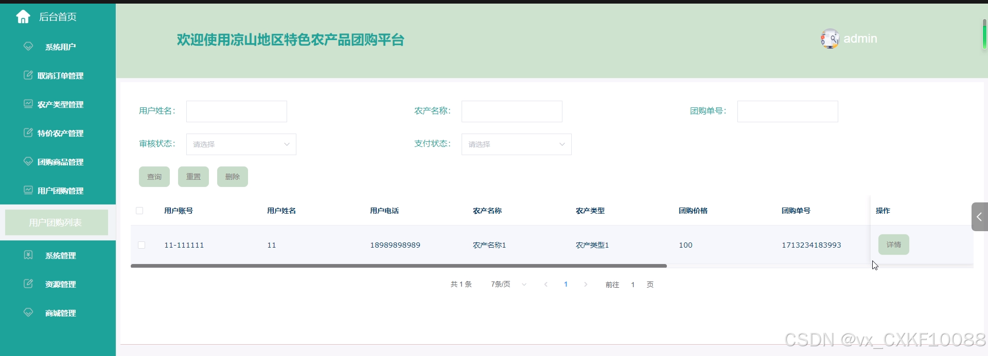 - 用户团购管理:管理员可以查看用户团购列表中某个农产品团购的详情并进行审核和回复,可以对列表信息进行查询、重置和删除操作。