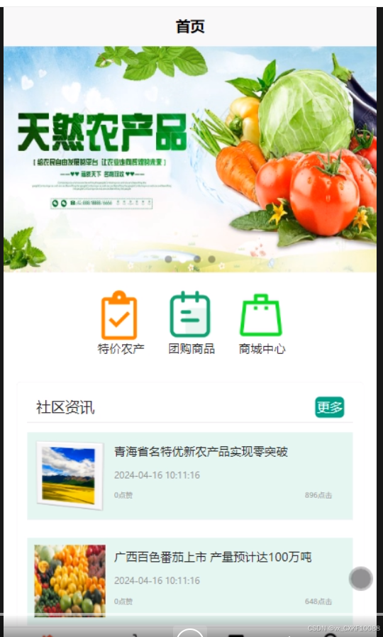 - 首页:用户可以查看首页展示的轮播图、特价农产、团购商品、商城中心、社区资讯等信息。用户可以查看特价农产列表中某个农产品的详情并可以点赞、收藏和评论;可以查看团购商品列表中某个农产品的详请并可以团购、点赞、收藏和评论;可以查看商城中心列表中某个商品的详情并可以领取优惠劵。