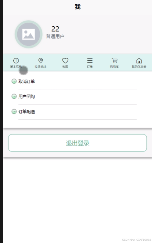 - 我的:用户点击首页右下角“我的”进入页面可以查看和管理基本信息、收货地址、收藏、订单、购物车、我的优惠劵、取消订单、用户团购和订单配送信息;点击“退出登录”即可退出系统登录。