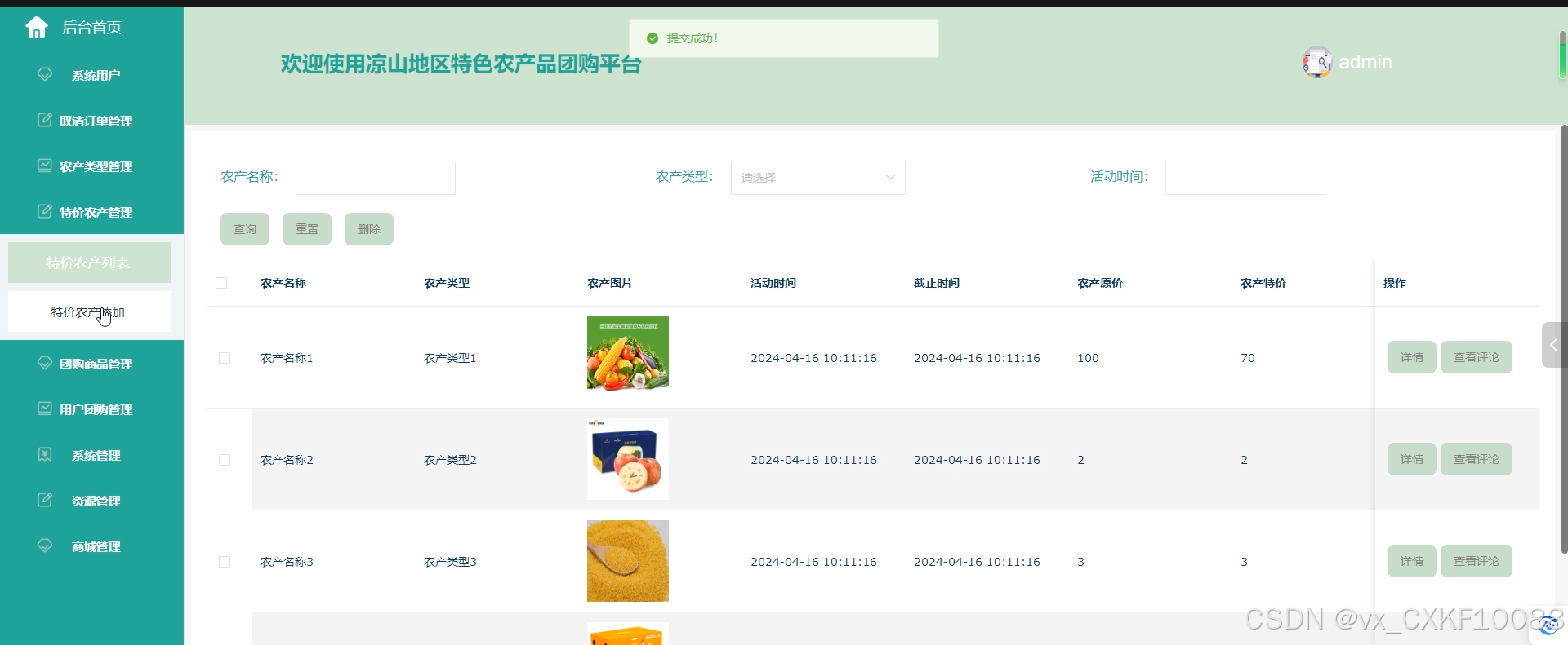 - 特价农产管理:管理员可以查看特价农产列表中某个农产品的详情和评论,可以对特价农产信息进行增删改查操作。