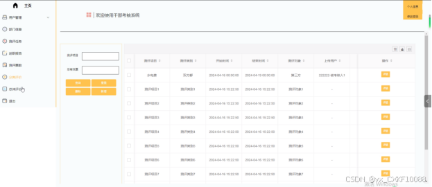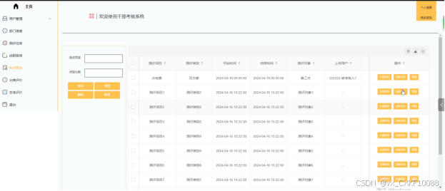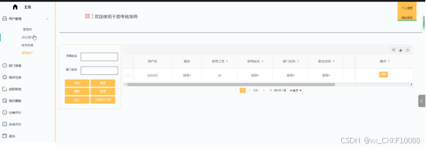- 用户管理:管理员负责对评议用户、被考核者、领导用户的账号添加,可以对系统用户信息进行增删改查操作。
