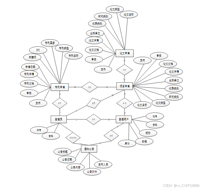 下面是整个高校科研成果管理系统中主要的数据库表总E-R实体关系图。