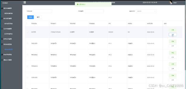 可查看提交的专利申请信息,进行增改删查操作,支持专利名称、壮丽类型、审核状态搜索,添加提交项目申请信息(专利名称、专利类型、专利国家、IPC、关键词、申请日期、专利详情、专利文档)等待审核,可点击查看详情。其界面如下图所示: