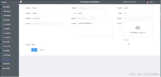 - 专利申请管理:可查看提交的专利申请信息,进行增改删查操作,支持专利名称、壮丽类型、审核状态搜索,添加提交项目申请信息(专利名称、专利类型、专利国家、IPC、关键词、申请日期、专利详情、专利文档)等待审核,可点击查看详情。