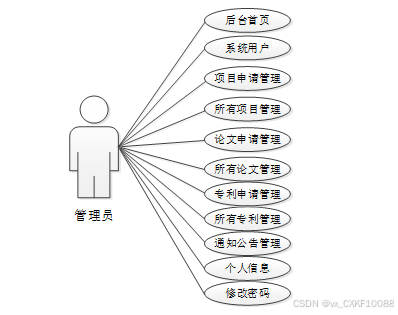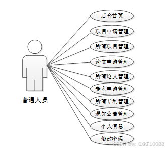 通过2.3功能的分析,得出了本高校科研成果管理系统的用例图: