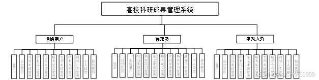 根据用户对系统的需求,要求系统简单操作,能够准确,完整的对信息进行管理。对高校科研成果管理做需求做解析后,划分为了普通用户、审批人员和管理员这三大功能板块。