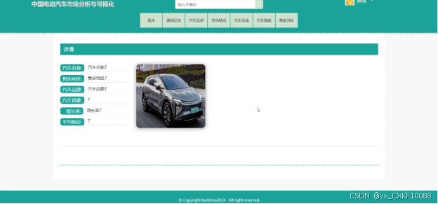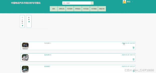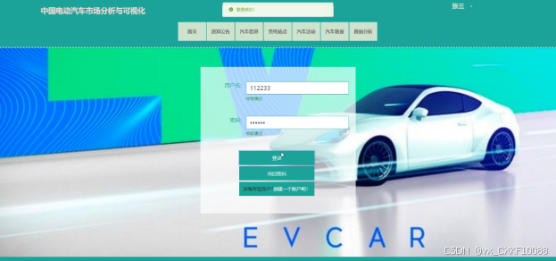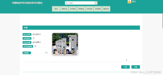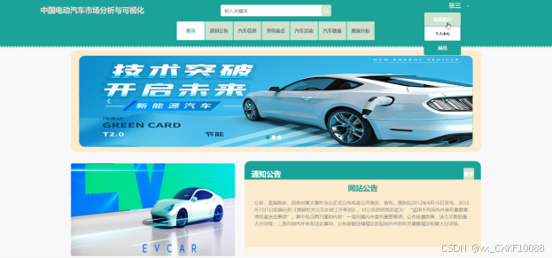 (2)查看中国电动汽车市场分析与可视化系统的首页信息:中国电动汽车市场分析与可视化系统的首页信息包含了首页、通知公告、汽车信息、充电站点、汽车活动、汽车数据、数据分析等。