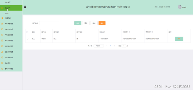 (2)系统用户:管理员可以对中国电动汽车市场分析与可视化系统中的管理员以及前台注册的普通用户进行增删改查。