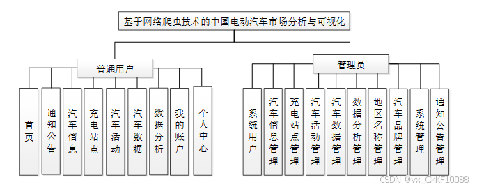 中国电动汽车市场分析与可视化系统我划分为了普通用户模块和管理员模块这两大部分。