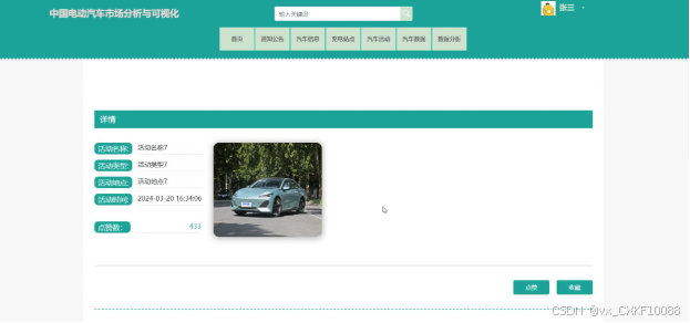 当访客点击中国电动汽车市场分析与可视化系统中导航栏上的“汽车活动”后将会进入到该“汽车活动”列表的界面,然后选择想要看的汽车活动,点击进入到详细界面,在详细界面可以点赞、收藏、评论等操作。汽车活动界面如下图4-6所示。