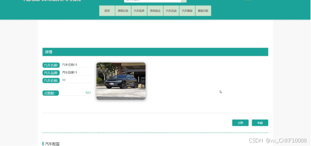 (4)汽车信息:用户可以查看汽车信息,在查询到自己想要了解的汽车信息的时候,可以进入查看详细的介绍,包括汽车名称、汽车品牌、汽车价格、汽车配置等信息,在汽车信息详情这个界面,同时支持用户对汽车信息进行收藏、点赞以及评论的功能。