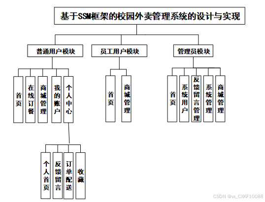 在SSM框架的校园外卖管理系统中,功能需求分析涉及多个方面,包括系统用户、反馈留言管理、系统管理和商城管理。