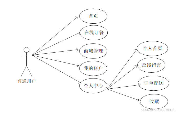 普通用户的功能:首页、在线订餐、 商城管理、我的账户、个人中心(个人首页、反馈留言、订单配送、收藏)等功能。