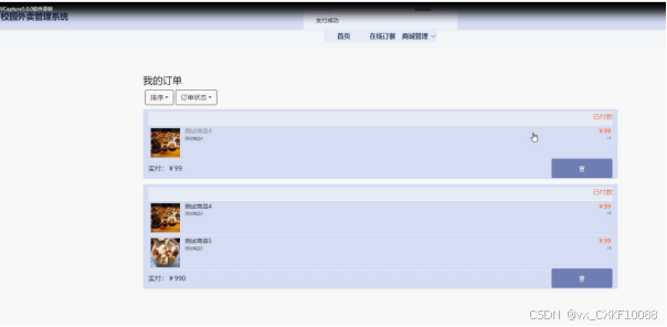 用户可以查看订单的详细信息,包括订单编号、下单时间、订单备注等,可以对订单进行支付。我的订单界面如下图所示。
