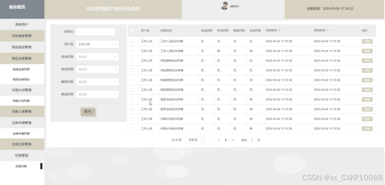 (10)权限管理:当管理员点击”权限管理“这一菜单时,可查看所有的用户,可对每个用户权限的进行增删改查。
