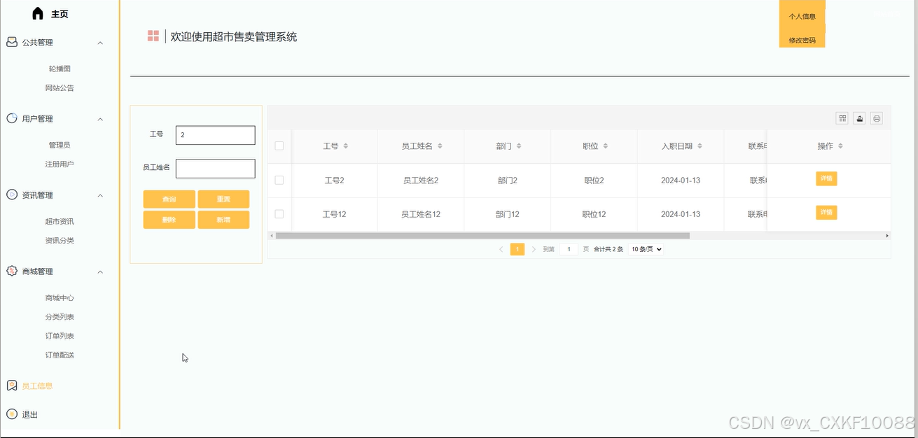 管理员可以对员工进行增删改查操作,查看员工详情,通过工号、员工姓名进行搜索,实现对员工信息的管理和监督。界面如下图所示。