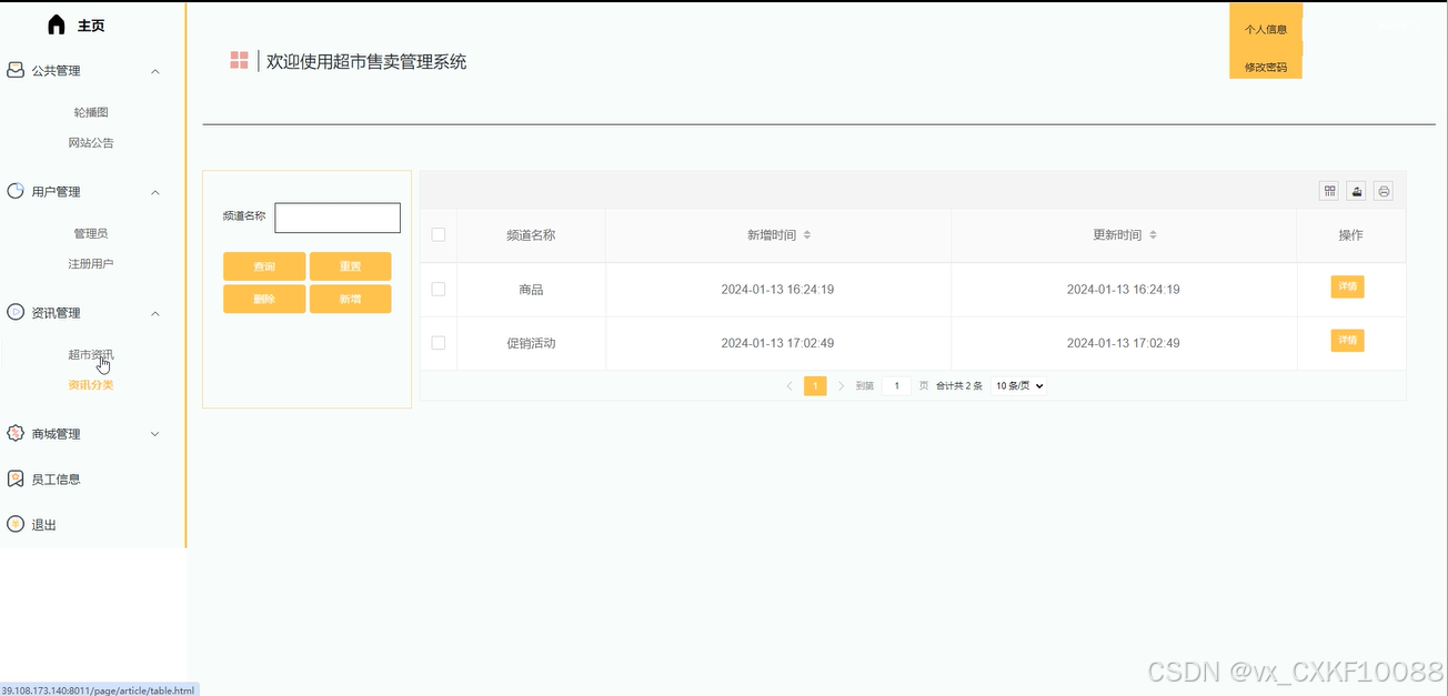 (5)资讯管理:在资讯管理中,管理员可以管理超市资讯,包括增删改查、查看详情、查看用户评论,以及通过标题、标签、分类进行搜索,同时可以管理资讯分类,进行分类的增删改查操作,通过频道名称进行搜索,实现对资讯内容的全面管理和分类展示。