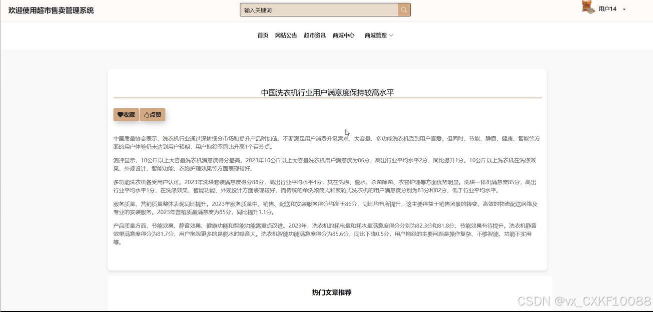 (3)超市资讯:用户可以浏览超市所有的资讯信息,包括最新活动、产品推荐等内容,并可以对资讯进行点赞、收藏,并发表评论,实现用户对资讯的互动参与,提升用户体验和参与度。