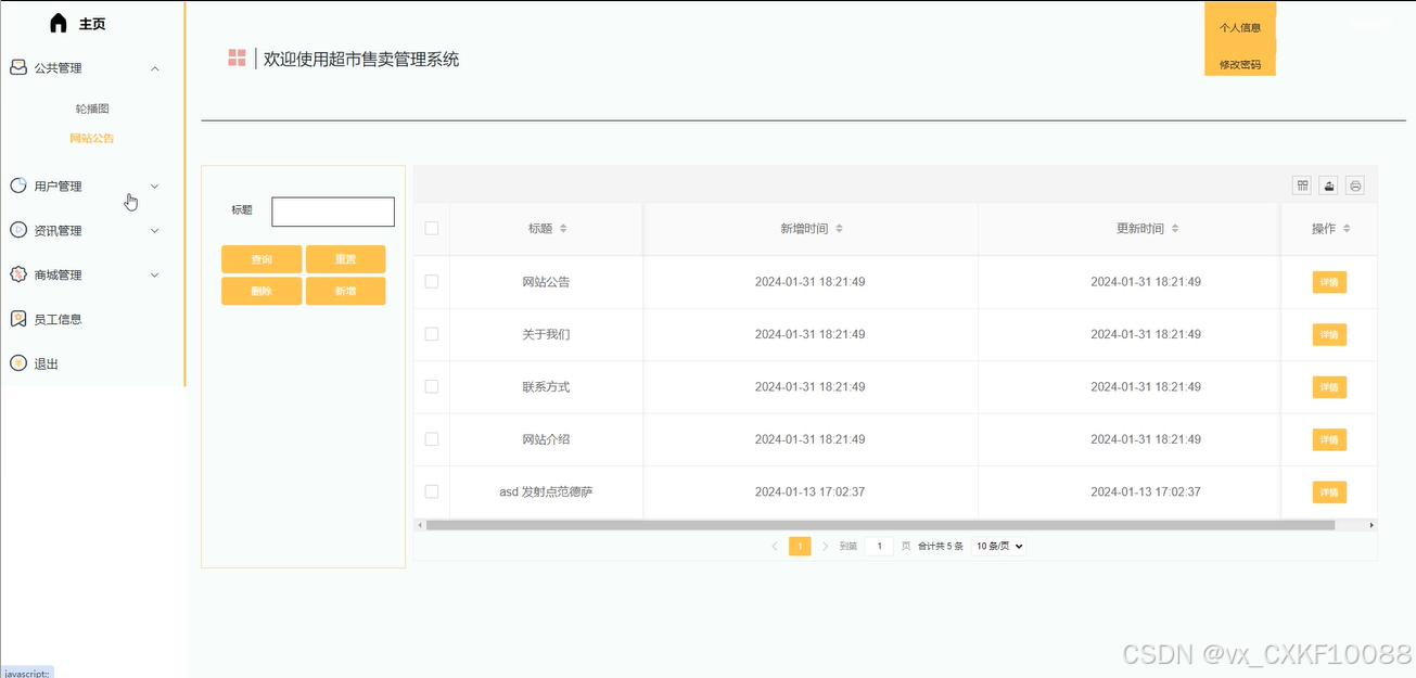 (3)公共管理:在公共管理模块中,管理员可以管理轮播图,包括增加、删除、编辑和查看轮播图详情,同时可以管理网站公告,进行增删改查操作,查看公告详情,并通过标题进行搜索,实现对网站内容的灵活管理和发布。