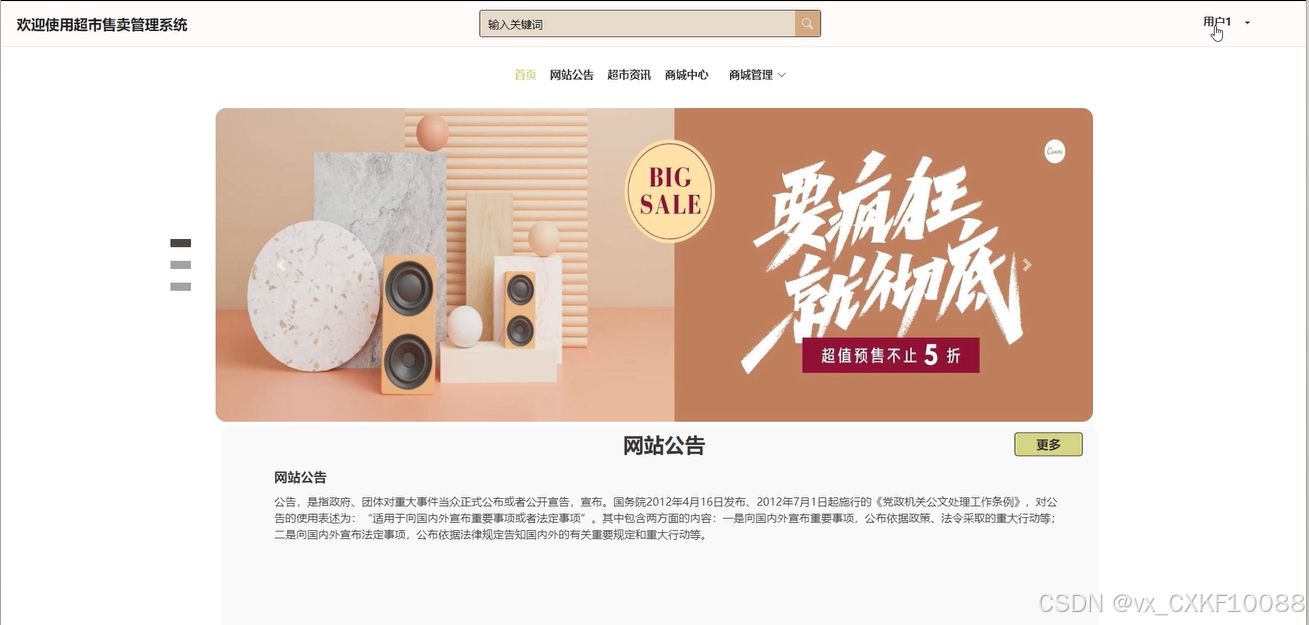This article is based on the SSM technology framework and designs and implements a supermarket sales management system, aiming to provide efficient and convenient management tools for supermarket managers. The system distinguishes different user roles through the administrator login function, providing functions such as product management, mall management, mall center management, and user management. Administrators can input, edit, and delete product information, monitor and adjust inventory, analyze sales data, and develop reasonable strategies. Users can log in to the system through their account, browse and purchase products, and view personal orders and order delivery records. This system can improve the work efficiency and management level of supermarket managers, reduce labor costs, optimize mall management and sales strategies, and provide strong support for supermarkets to achieve more efficient and intelligent operations.
