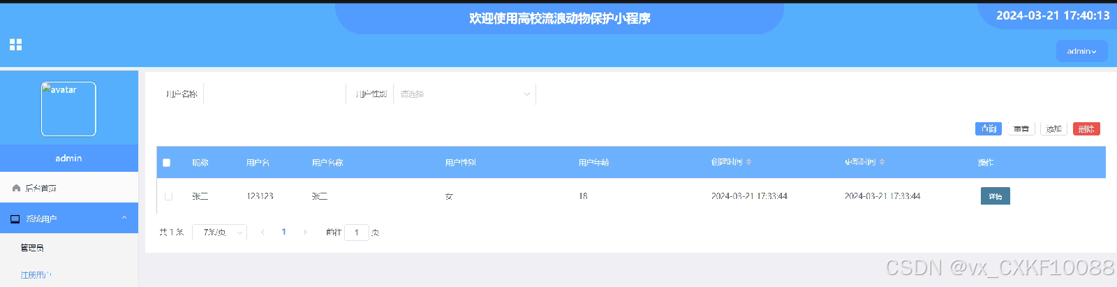 系统用户管理页面,管理员可对系统前台注册的用户以及管理员进行管理,如图5-8所示。