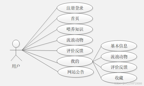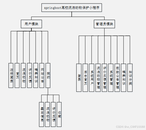 通过使用高校流浪动物保护小程序,我们可以实现多种功能,从而满足用户的各种需求。该系统的功能结构如图4-5所示,具有良好的完整性和可靠性。