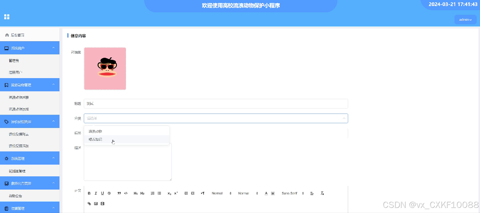 管理喂养知识内容,包括添加、编辑、删除喂养知识文章,设置知识分类和标签,确保喂养知识信息的及时更新和质量,为用户提供宠物喂养指导和知识分享,如图5-11所示。