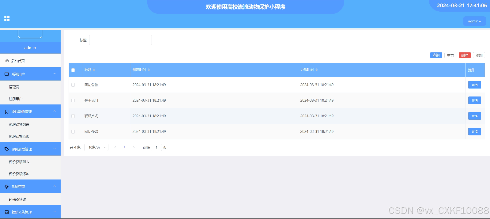 管理员可能发布和管理救助公告信息,包括发布流浪动物救助信息等,实现公告的新增、编辑、删除和定时发布功能,确保用户及时了解救助信息和重要公告,如图5-9所示。