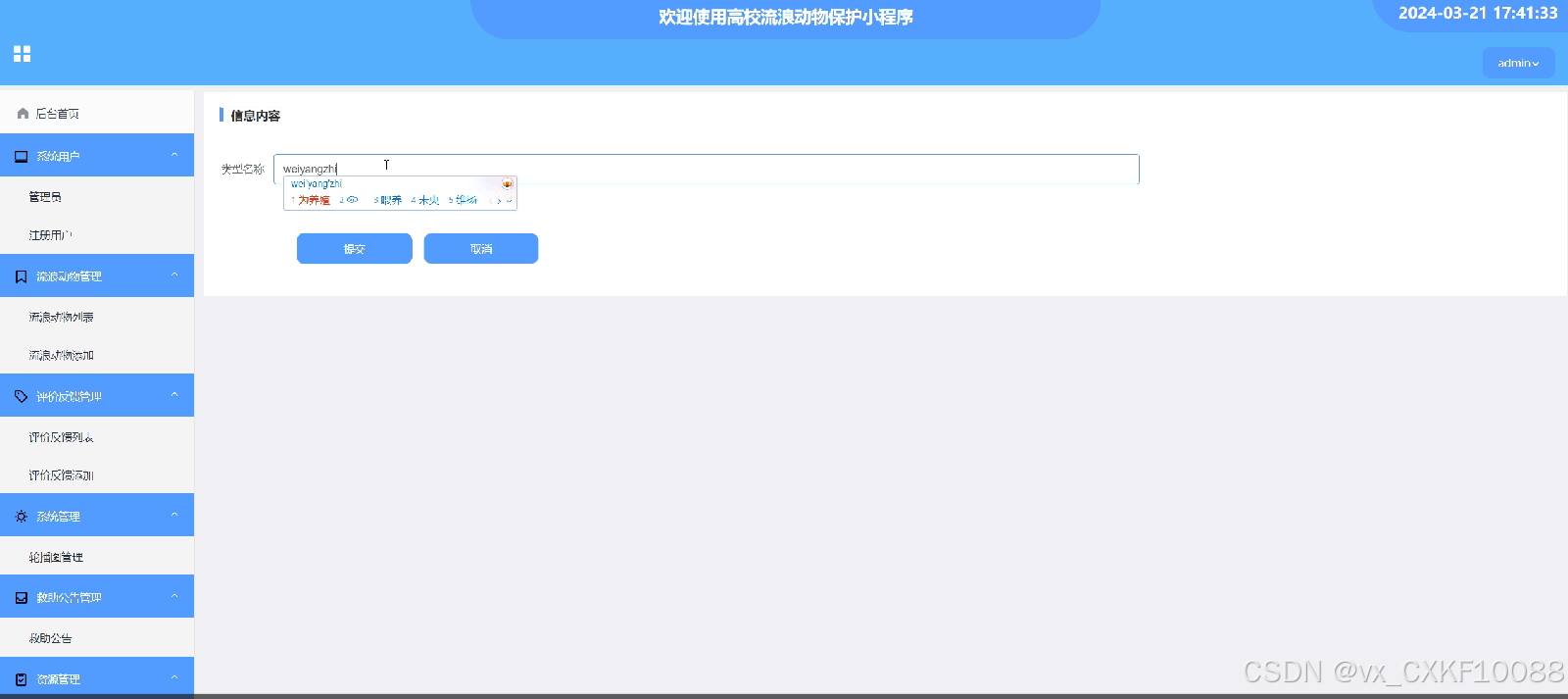 关键词:高校流浪动物保护;微信小程序;java语言,springboot框架。