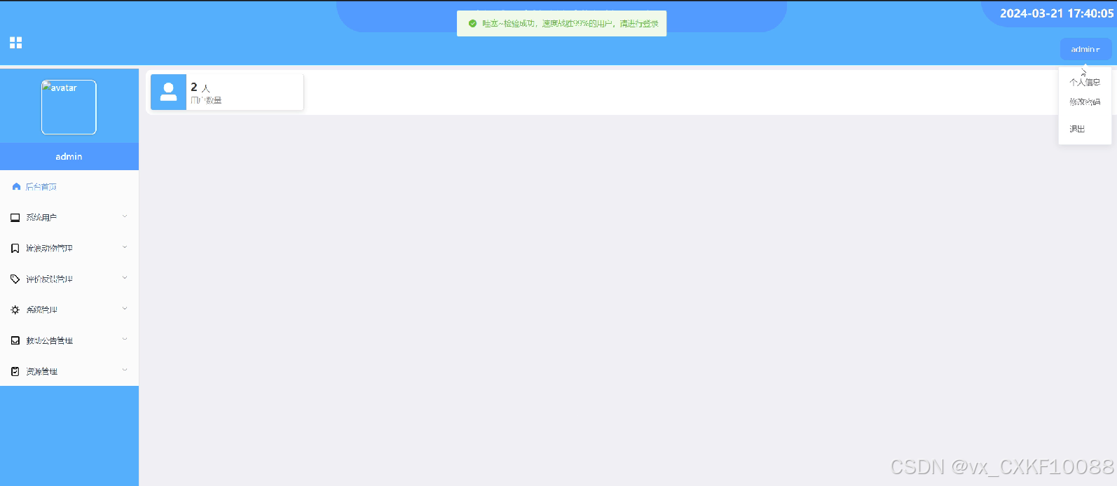 通过管理员功能页面,用户可以查看首页、系统用户(管理员、注册用户)、流浪动物管理、评价反馈管理、系统管理、救助公告管理、资源管理(喂养知识、知识分类)个人信息、修改密码等,并且可以根据需要进行相应的操作,如图5-7所示。