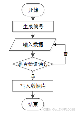 用户成功登入系统后就能够实现增加数据的操作,增加数据的编号由系统生成,用户不能随意填写,除了编号以外,其他增加信息用户自己填写,填写后的信息经过系统验证,验证通过后即可完成数据新增,数据新增的流程图如下图2-1所示。