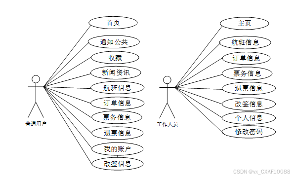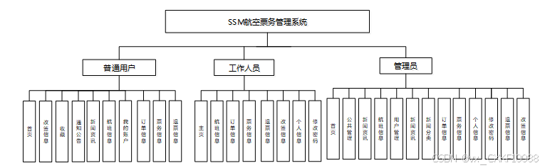 按照航空票务管理系统的角色,划分为了普通用户模块、工作人员模块和管理员模块这三大部分。