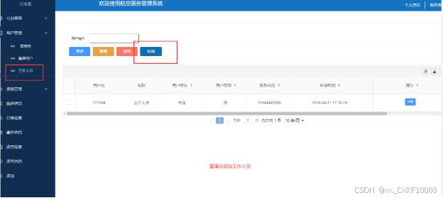 航空票务管理系统中的管理人员是可以对注册的普通用户、工作人员进行管理的,也可以对管理员进行管控。界面如下图4-7所示。
