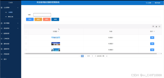 (2)公共管理:进入后台首页工具栏点击“公共管理”这个按钮可以查看所有轮播图、退票信息等信息,可以进行详情查看、删除、查看评论等操作。