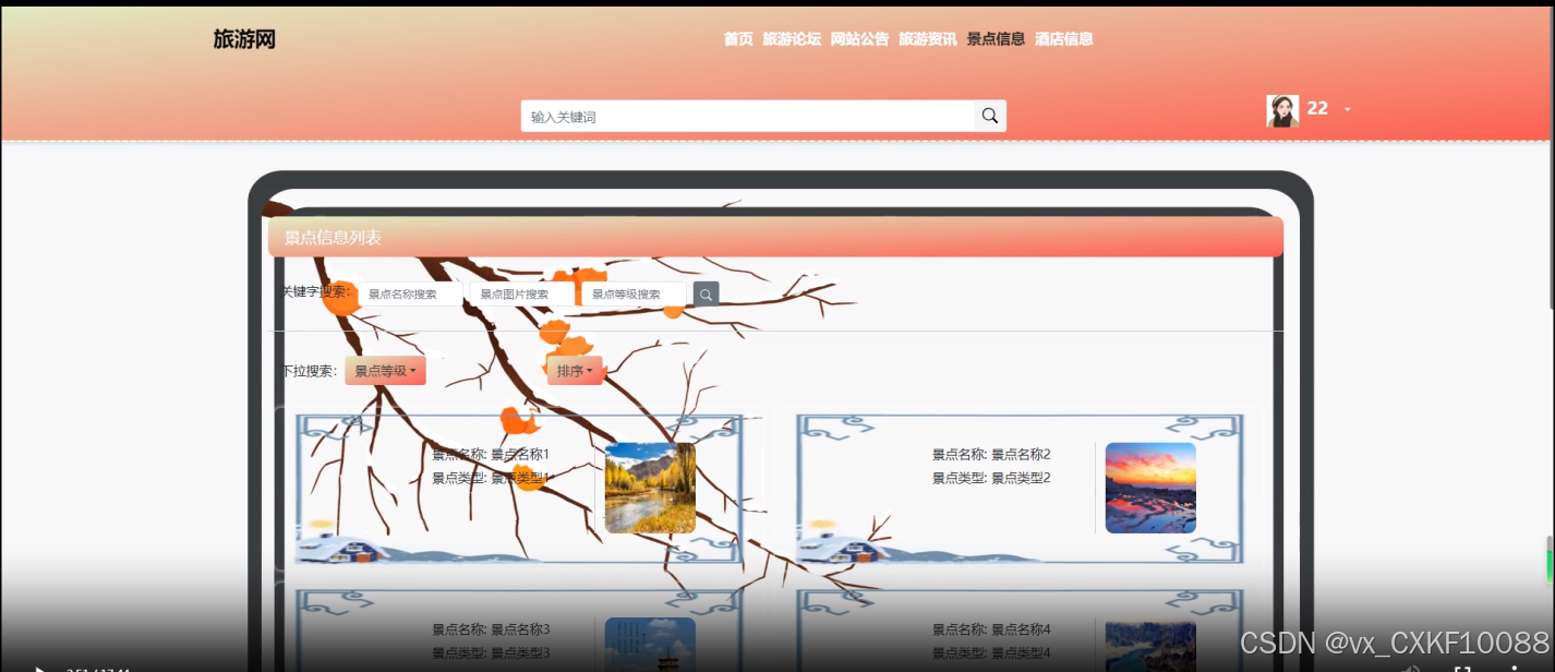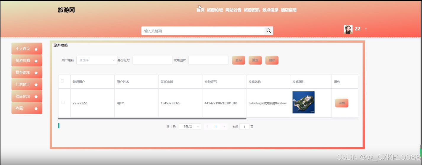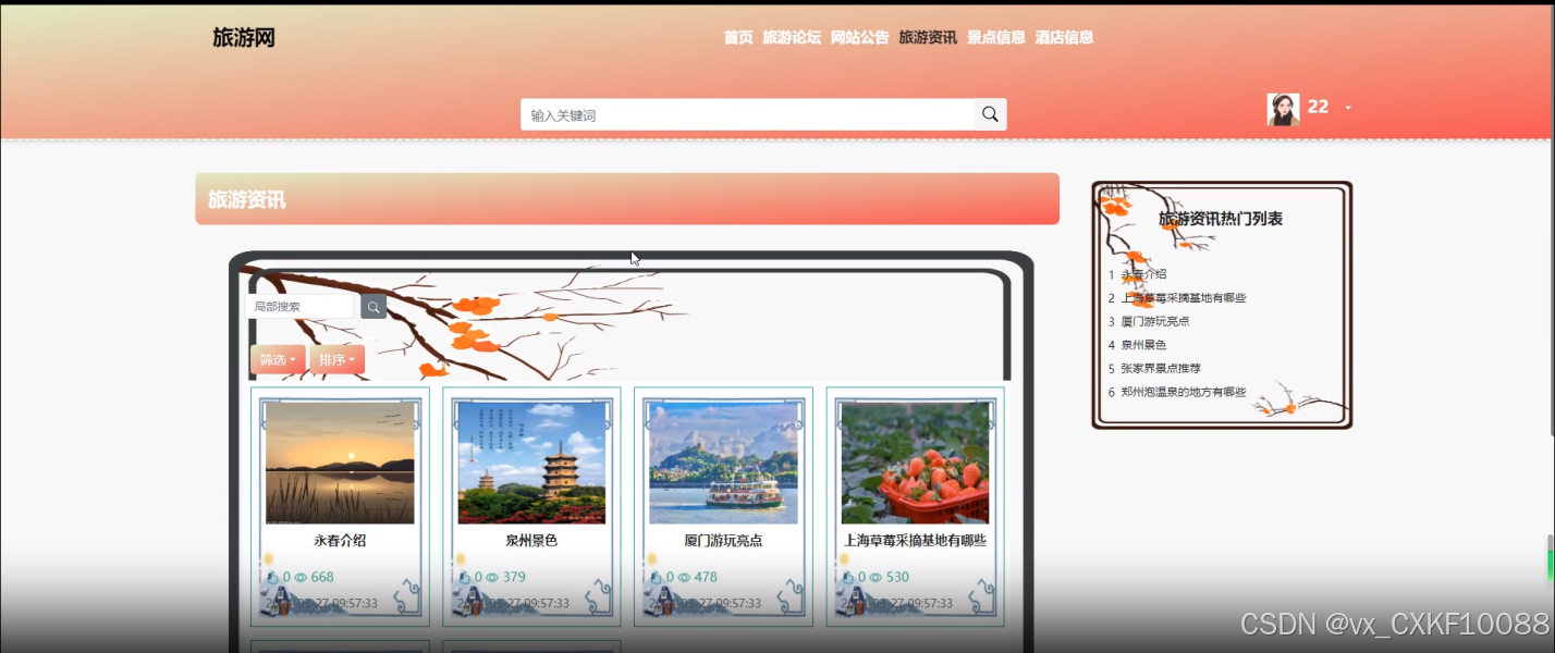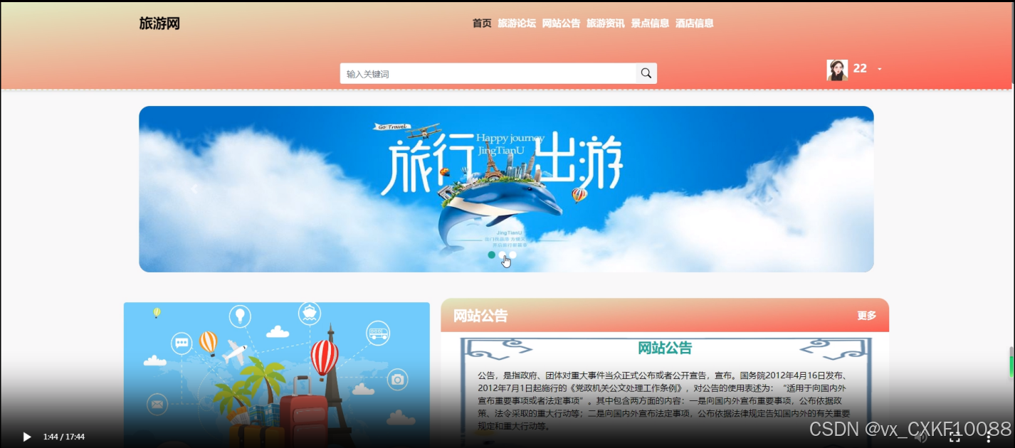 - 首页:用户可以查看首页展示的轮播图,旅游资讯、景点信息推荐等信息。