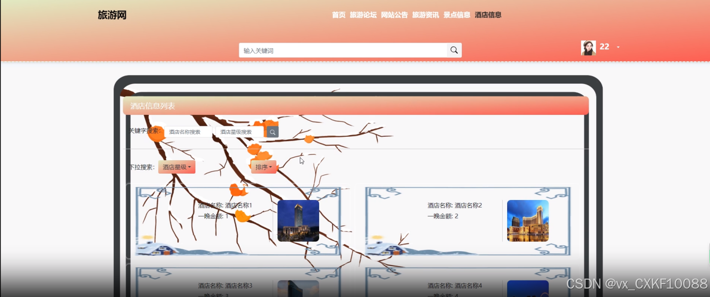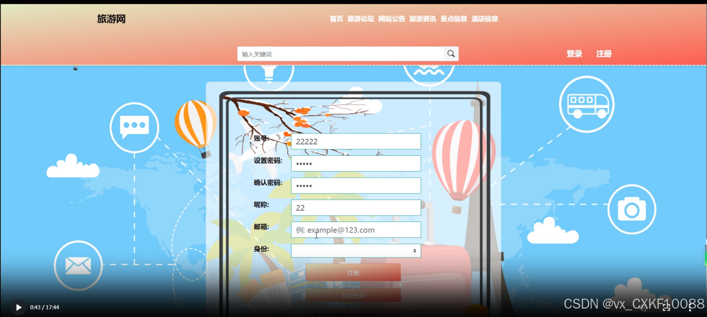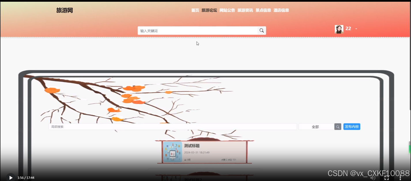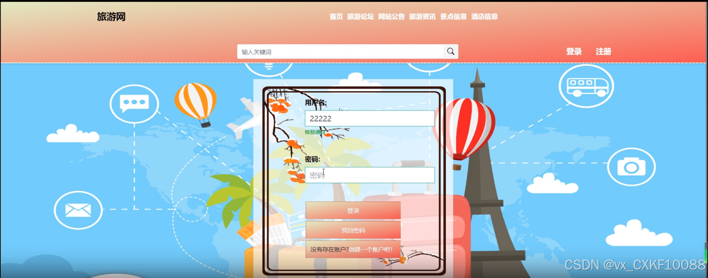 - 首页:用户可以查看首页展示的轮播图,旅游资讯、景点信息推荐等信息。