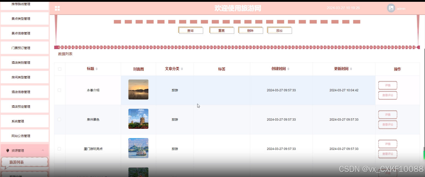 - 资源管理:管理员可以查看旅游列表中某一旅游资讯详情和评论信息,可以对旅游列表、旅游分类信息进行增删改查操作。