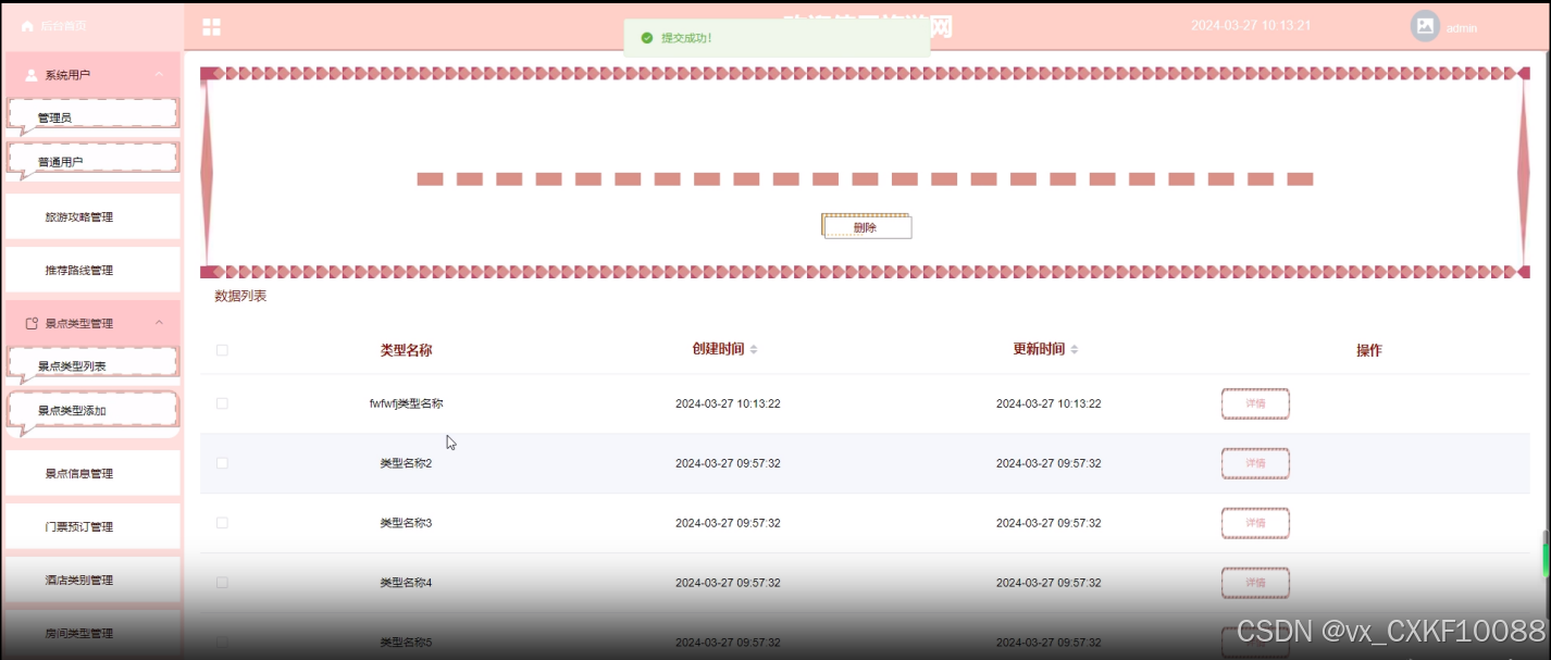- 景点类型管理:管理员可以查看景点类型列表中某一类型的详情息,可以对景点类型进行增删改查操作。