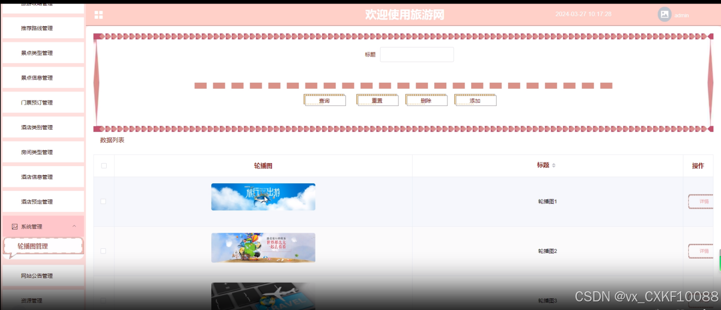 - 系统管理:管理员可以对系统轮播图信息进行增删改查操作。