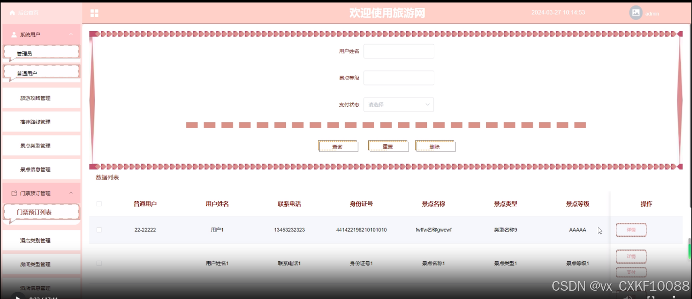 - 门票预订管理:管理员可以查看门票预订列表中某一订单的详情,已完成支付的订单可以查看用户的支付信息,可以对列表信息进行查询、重置和删除操作。