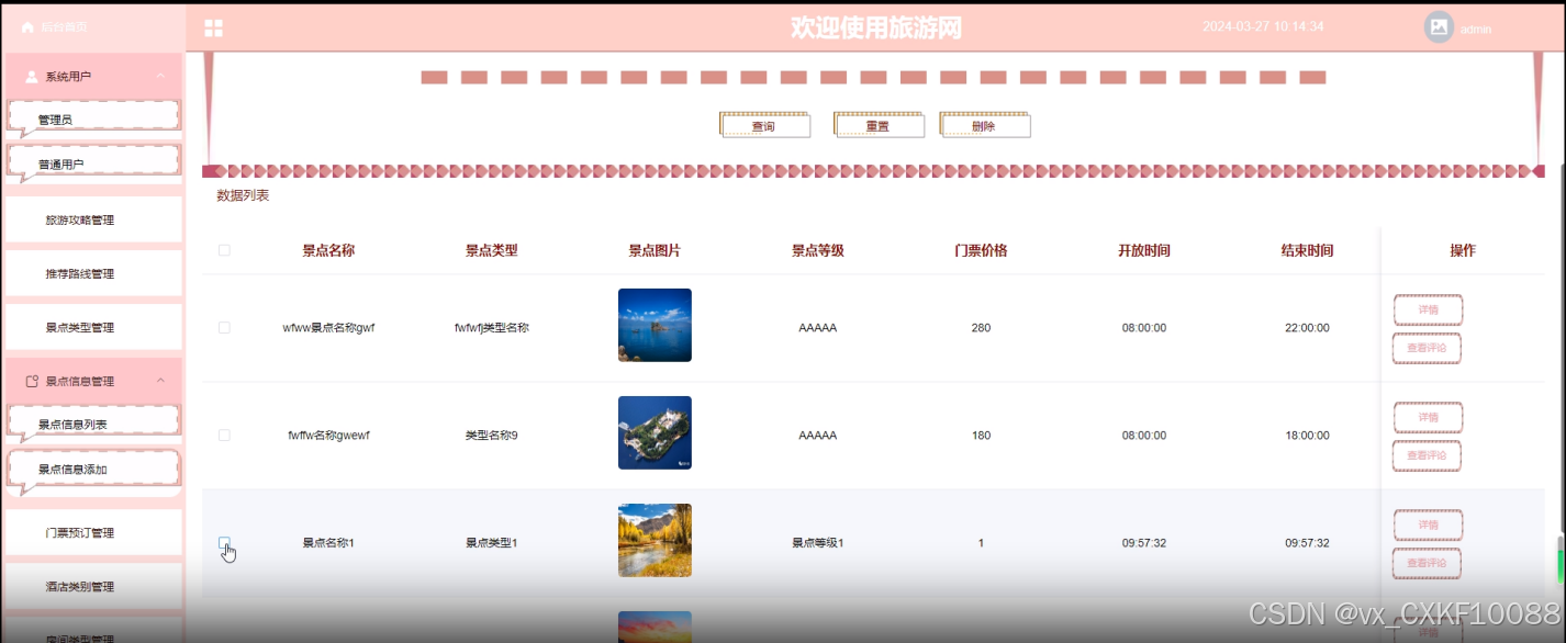 - 景点信息管理:管理员可以查看景点信息列表中某一景点的详情和评论信息,可以对景点信息进行增删改查操作。