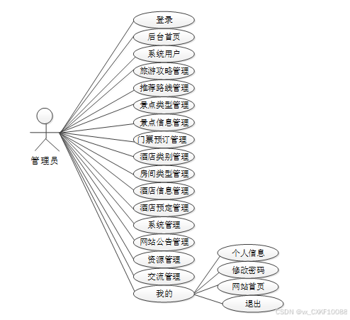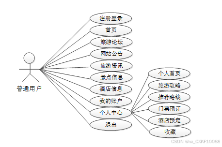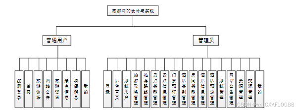 按照旅游网的设计与实现的角色,主要包括普用户模块和管理员这两大模块。各模块功能如下: