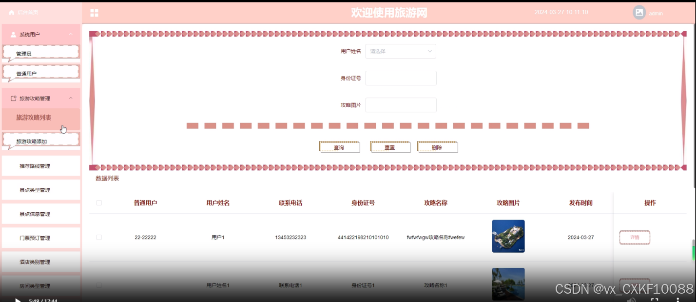 - 旅游攻略管理:管理员可以查看旅游攻略列表中某一攻略的详情,可以对旅游攻略信息进行增删改查操作。