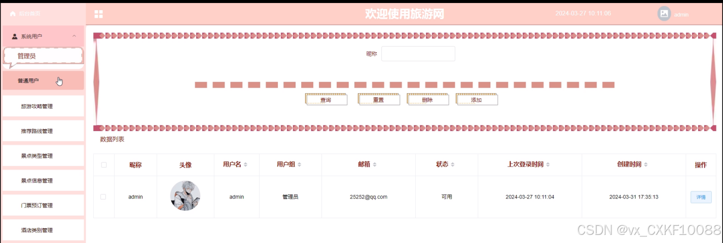 - 系统用户:管理员可以查看系统用户(管理员、普通用户)列表中某一用户的详情,可以对系统用户信息进行增删改查操作。